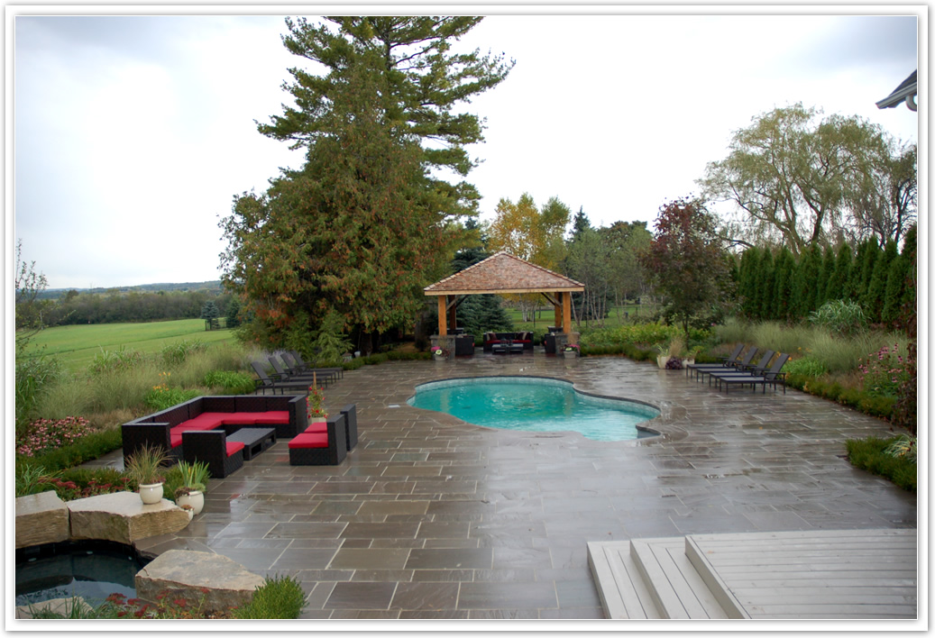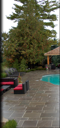 The existing pool with the traditional 3' concrete apron was in terrible shape and needed to be completely renovated – new steps, liner, coping, plumbing, pool equipment, 3" natural stone coping, and a 3000 sq ft flagstone patio were used to update the space.