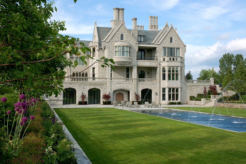 This garden was designed as an English Garden to suit the Tudor Architecture of the limestone mansion. The front garden includes a formal cobble main driveway as well as a parking courtyard for the garage area and service entrance. Countless boxwoods, yews, beech, and roses flank the front elevation of the home to create a mass planting simple yet classic approach to the home.