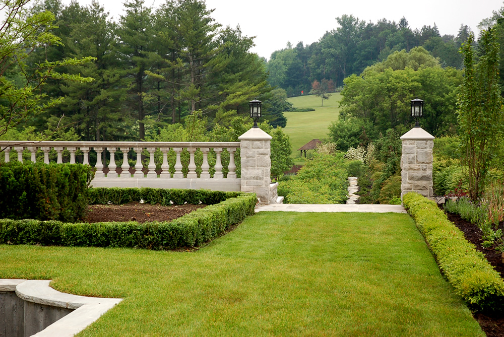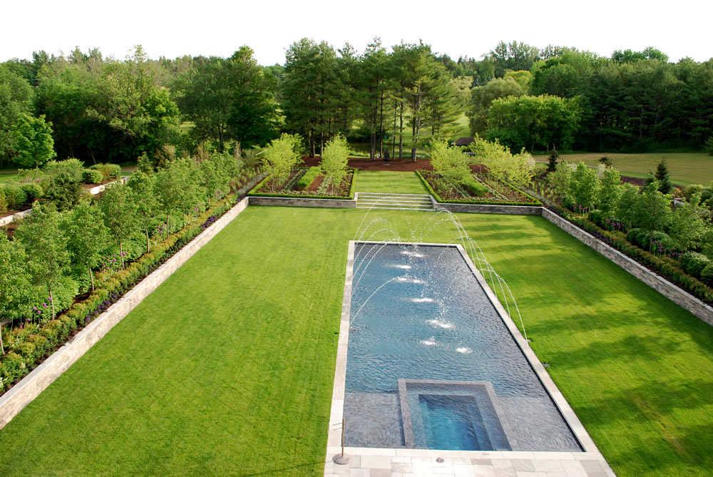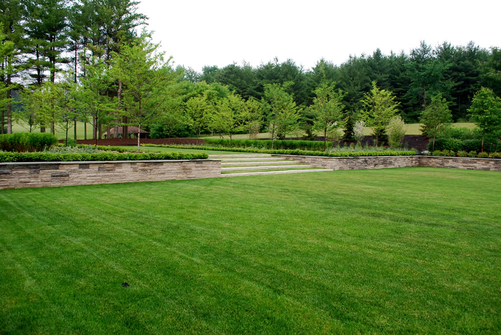 The ten acre area that contains the main garden on this 300 acre farm was stripped of all trees to create the dramatic grade change required to accommodate the walk outs, the pool garden and the rear terrace. Over 250,000 yards of clean fill was imported to create the grades surrounding the home. We placed 15,000 yards of screened topsoil to fine grade and sod the site. Hard surfaces were in excess of 30,000 square feet of natural stone with concrete foundations. We used a 90” tree spade to import over 500 mature trees to the property. The main entrance driveway is lined with eleven hundred beech trees which creates a really dramatic approach to this spectacular home and garden.