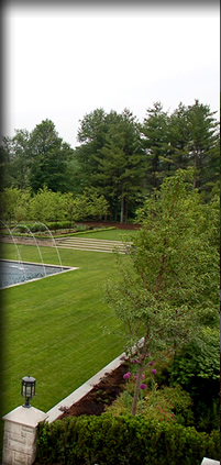 The pool area was an engineering challenge in itself. The area was approx 22’ lower on one side than the other, and we decided to create a symmetrical design in this space. We spent a full winter creating the even grades and subsoil drainage system to ensure the pool elevation didn’t become a pond! The pool which is 30x90 has a 16x16 spa under water so it is not visible when its off. The spa is superheated underwater and cannot be detected when its off so the pool appears to be a large reflecting pond when not in use. There are over six hundred feet of hand cut limestone drywalls surrounding the pool, a 3500 square foot pool patio complete with a chefs outdoor kitchen, and over six hundred tons of large rockery set in behind the plantings to create the tiered garden effect we desired. The pool equipment is housed in an underground 1000 sqft bunker we designed and installed next to the outdoor kitchen so that the equipment would not be seen from the upper balconies of the home. |