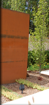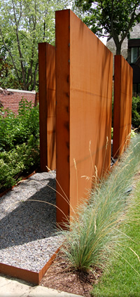 The rows of rectangular space are vastly different depending on which corner you are standing in. A commissioned bronze face adds a modern art element. Large steel sculptures were constructed in our fabrication shop to create strong vertical lines to emulate the vertical lines of the century old clay brick walls. Wooden fences were built of tongue and groove cedar and place on top of the brick foundation walls to ensure maximum privacy at street level. A 100’ span of an IPE deck boardwalk leads guests to the pool. Ipe was chosen for it’s beauty and long lasting life as well as being from a sustainable source.