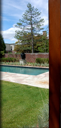 As one approaches this 10,000 square foot home from the front, one would not expect a private retreat in the backyard. The materials used on the project are simple. All foundations, swimming pool, slabs and walls are concrete faced with credit valley flagstone. Extensive planting around the perimeter was planned to create an elegant backdrop to the art and architecture of the garden. The long linear concrete pool adds the final touch to the overall feel of old meets new. |