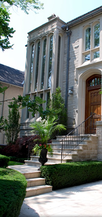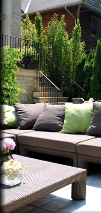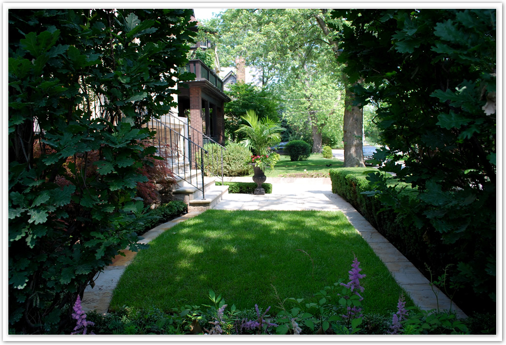 A large cedar hedge was used around the perimeter of the garden to block to view of a soccer field directly behind this Rosedale home.