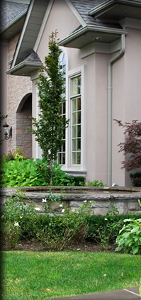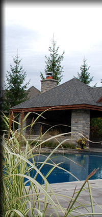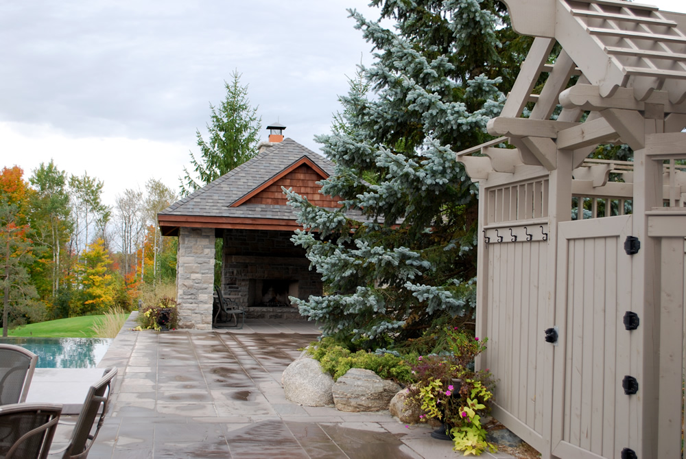 A large gazebo was installed to create an entertaining area that contains a wood burning fire adding both warmth and light. Custom fences and arbour were used to sculpt out a dramatic entrance and front landscaping was designed to enhance the original architecture of the house creating a formal appeal. Hedging and square cut stone were installed to highlight a circular pool and planting in the front of the residence add to the traditional and formal feel of the property. Added to the entranceway are hedges and large grand flagstone and circular stone inlay to mirror the shapes of the water feature.