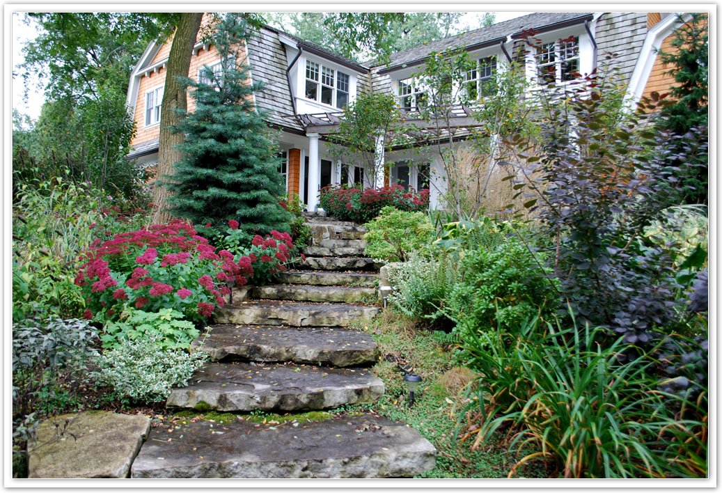 Large natural stone slabs planted with thyme were selected as the front garden surface, we constructed a large winding stone staircase that leads to a private two hole golf course we carved out of this narrow but deep two acre lot in the heart of Oakville.