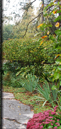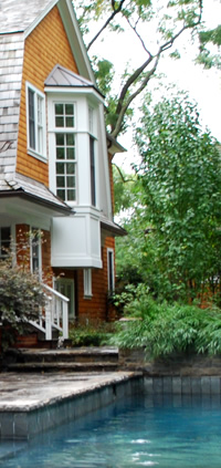 Stone entry pillars set the tone of the garden and a low stone wall was needed up the entire length of the 200' driveway to create a planter for the Hornbeam hedge we added to block a large public park next to the home. We installed the gunite swimming pool and spa with Owen Sound coping and flagstone patios. The pool includes a raised rear wall with a three spout custom made water feature and an endless pool swim jet system for exercise.