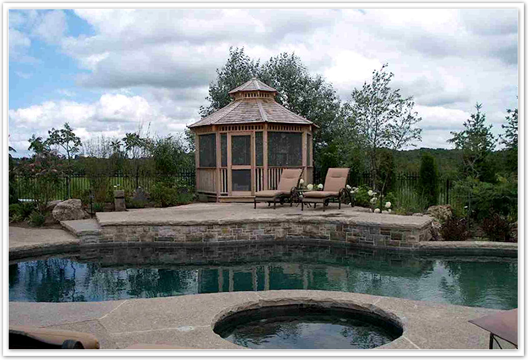 A gunite free form pool with a gray bottom is the central element. An adjacent in-ground spa compliments with all-season use. Spacious multi-level, mega flagstone patios flank the pool. Stone facing of the multi-level pool edge adds interest and detail. Large rockery stone placed in the gardens were native to the property.