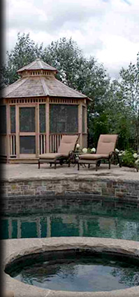 A spacious screened cedar gazebo and remarkable pool cabana bring all the amenities of entertaining outside. Repetitive and large-scale plantings seamlessly merge the new plant material into the existing landscaped areas. Landscape lighting and a state-of-the-art outdoor audio system complete this extraordinary weekend retreat.